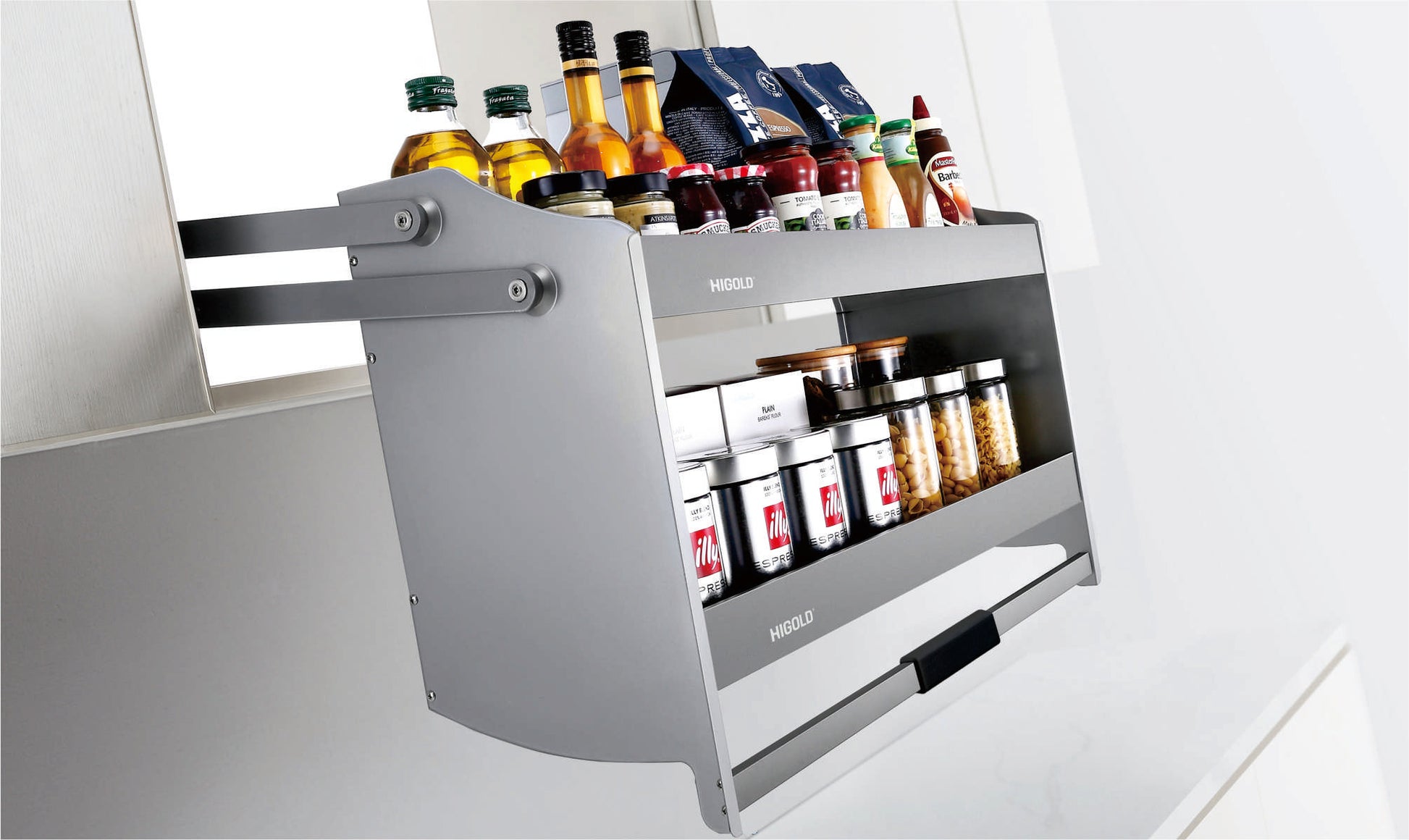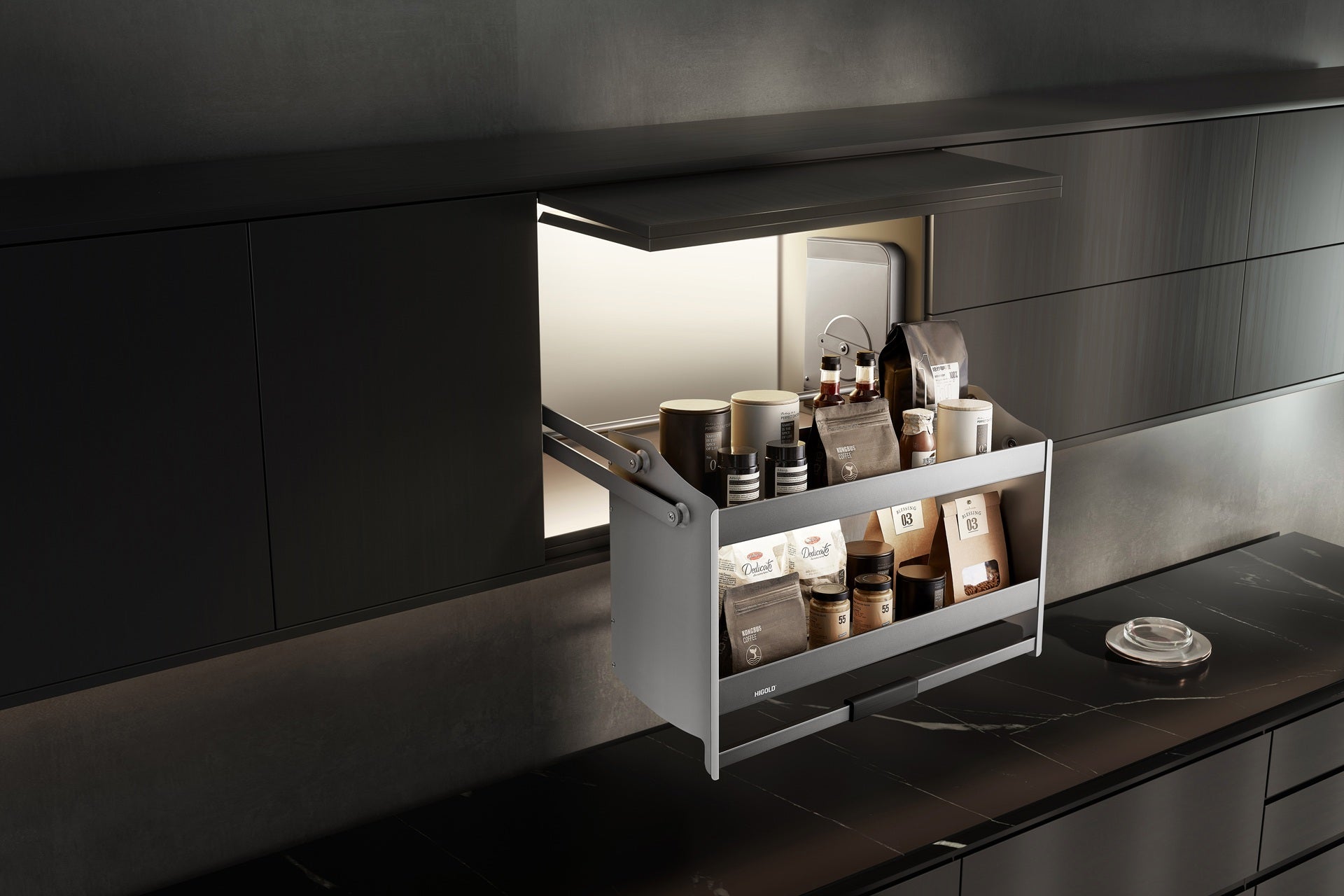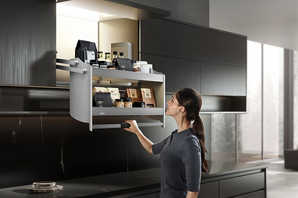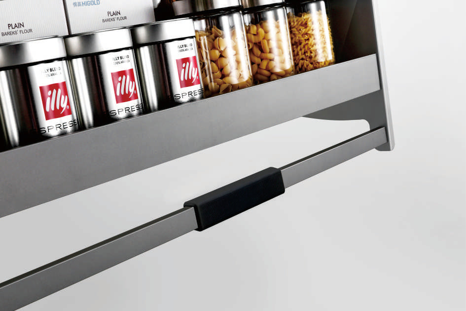 - Ergonomischer Zugang auf Knopfdruck – Der Beschlag lässt sich mit nur einer Hand mühelos aus dem Schrank nach unten ziehen.